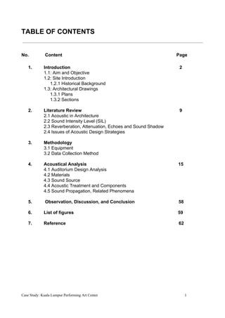 The document provides details on a case study of the acoustic design of the Kuala Lumpur Performing Art Center auditorium. It includes an introduction to the site and objectives of the study. Plans and sections of the auditorium are shown. The methodology section outlines the equipment used to collect data on site, including measurements of dimensions and sound level readings. An analysis of the auditorium design discusses aspects like its rectangular shape, inclined seating layout, and fan-shaped seating arrangement. Acoustic properties of the materials used and sound propagation phenomena are also examined.