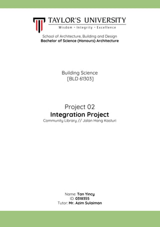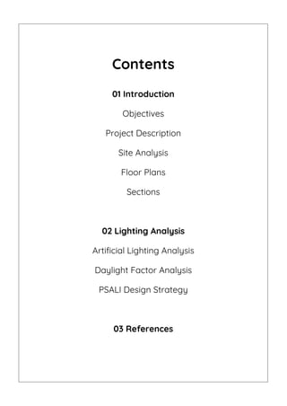 This document provides details on the lighting analysis for a community library project in Kuala Lumpur, Malaysia. It includes summaries of the artificial lighting analysis and daylight factor analysis conducted for two specific spaces - an art gallery and a discussion area. For the art gallery, calculations determine that 27 recessed LED fixtures are needed to provide adequate 300 lux illumination. For the discussion area, daylight factor calculations show the space achieves 3.32% daylight factor and 664 lux of natural light, enough for activities. However, light shelves are recommended to improve distribution.
