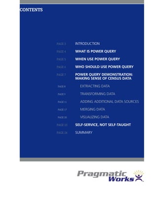 The document provides a comprehensive overview of building self-service BI solutions using Power Query, a Microsoft tool that facilitates data extraction and transformation. It emphasizes the increasing demand for agile data solutions in business intelligence, highlighting the roles users may take on when using Power Query and its application in manipulating data from various sources, such as census data. Key demonstrations illustrate the extraction, transformation, and merging of data, showcasing how Power Query can simplify tasks traditionally handled by more complex ETL tools.
