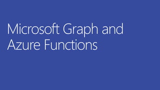 The document discusses building serverless applications using Microsoft Graph and Azure Functions, highlighting the extensive capabilities of Microsoft Graph APIs for accessing data related to users, groups, devices, and various Office 365 services. It covers how to leverage Azure Functions for tasks like fetching calendar events, updating SharePoint lists, and monitoring user training completion. Additionally, it provides insights into permission types and offers links to further resources and examples.
