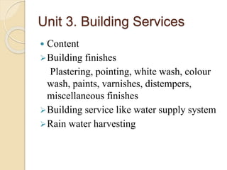 This document provides an overview of building services and finishes, including plastering, pointing, white wash, color wash, paints, varnishes, and distempers. It discusses the objectives and types of various finishes. Plastering covers walls and surfaces, while pointing finishes mortar joints. White wash and color wash protect surfaces from weathering. Paints, varnishes, and distempers provide both protection and decoration. The document also covers miscellaneous finishes like tiling, papering, tarring, waxing, oiling and glazing.