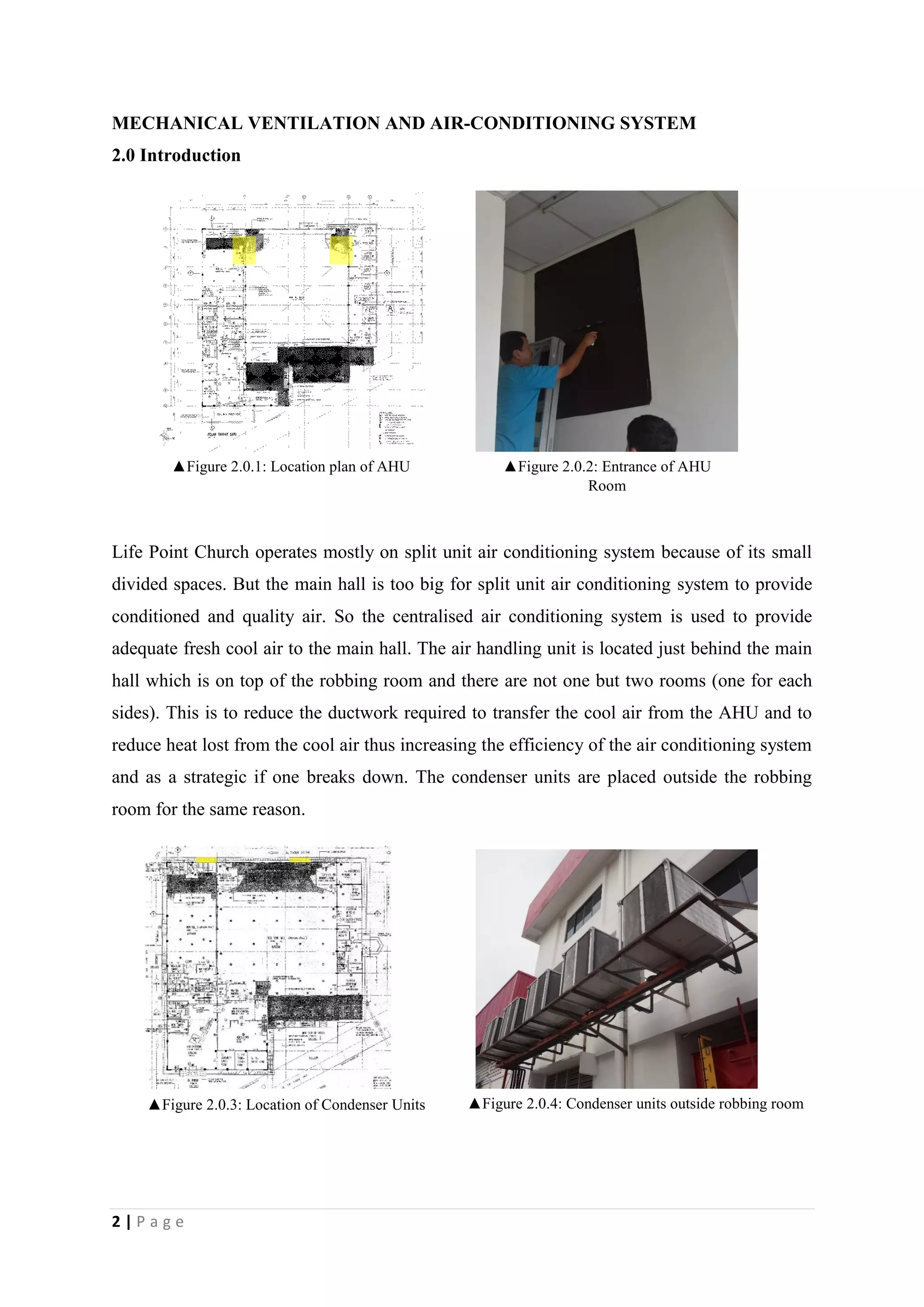 This document provides an overview of the mechanical ventilation and air conditioning systems used in the Lifepoint Building located in Subang Jaya, Malaysia. It was originally an office building that was renovated into a church and community center. The main hall uses a central air conditioning system with air handling units located above the storage room to supply cool air. Split unit AC systems are used in smaller spaces. The mechanical ventilation system uses natural inlet through windows and mechanical exhaust via propeller fans in the toilets and pantry. The air conditioning and ventilation systems aim to provide a comfortable indoor environment for occupants as required by building standards and regulations.