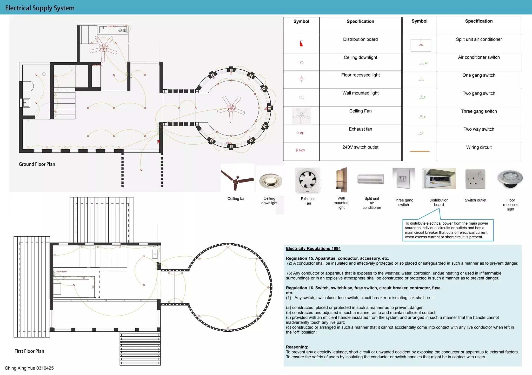 The document provides specifications for electrical and plumbing symbols used in schematic drawings. It includes symbols for lighting fixtures like ceiling downlights and wall lights, switches, air conditioners, distribution boards, and more. Regulations are presented for safely installing conductors, switches, and protecting apparatus from external factors. Plumbing guidelines specify installing hot water systems, traps, vent pipes, and preventing drainage systems from being used as vents. Roof drainage and preventing dampness in buildings is also addressed.