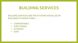 This document provides an extensive overview of building services and standards in architectural design, focusing on aspects such as lighting, ventilation, acoustics, HVAC systems, fire safety, and plumbing. It emphasizes the importance of creating comfortable, functional, and safe environments through proper design and installation of systems that enhance air quality, sound insulation, and fire prevention. Additionally, it highlights the significance of sanitation and water management in promoting public health within building infrastructures.