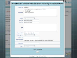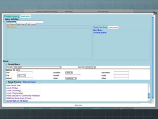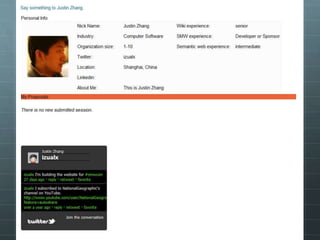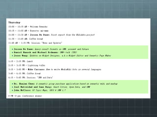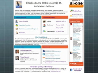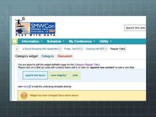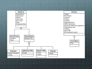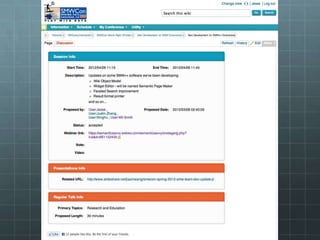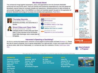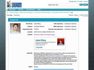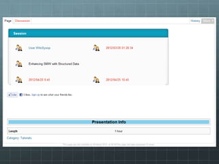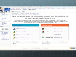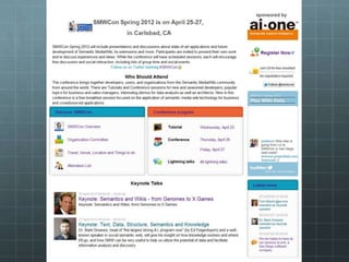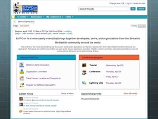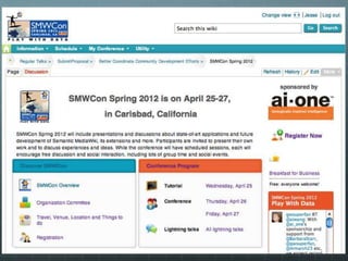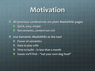 The document outlines the development of the SMWCon site using Semantic MediaWiki, emphasizing the motivation to move beyond simple MediaWiki pages to a more semantic, content-rich experience. It describes the process, including ontology creation and various development efforts totaling 201 hours over different tasks. Additionally, it mentions social activities planned during the conference and provides logistical details for the event.
