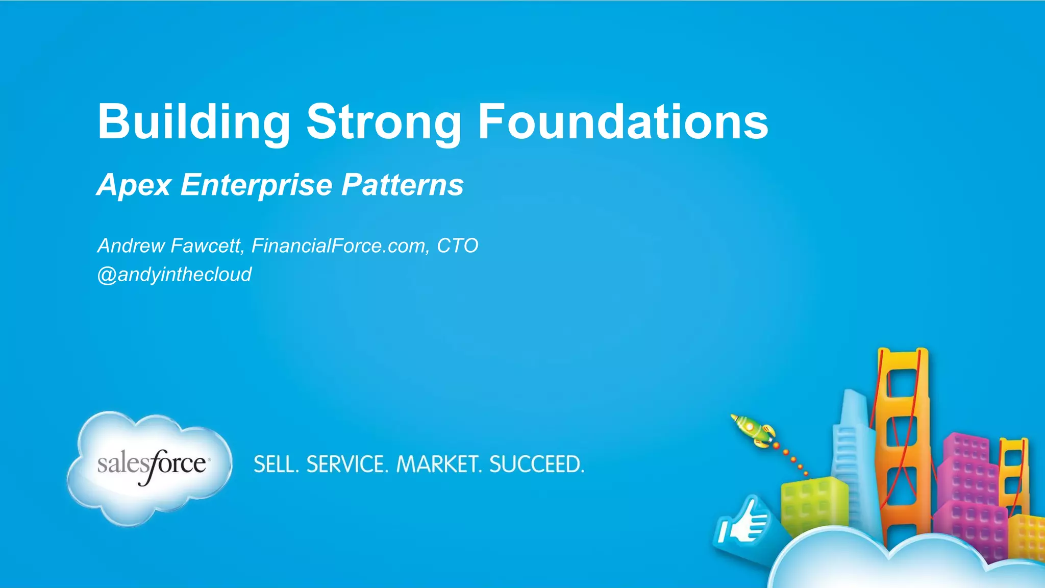The document discusses Apex Enterprise Patterns and best practices for developing in Salesforce, focusing on separation of concerns (SoC) and the 'don't repeat yourself' (DRY) principle. It highlights common issues encountered in Apex development, provides guidelines for structuring applications with service, domain, and selector layers, and outlines strategies for avoiding pitfalls related to error handling and governor limits. The document also includes references to design patterns, example code snippets, and resources for further reading.