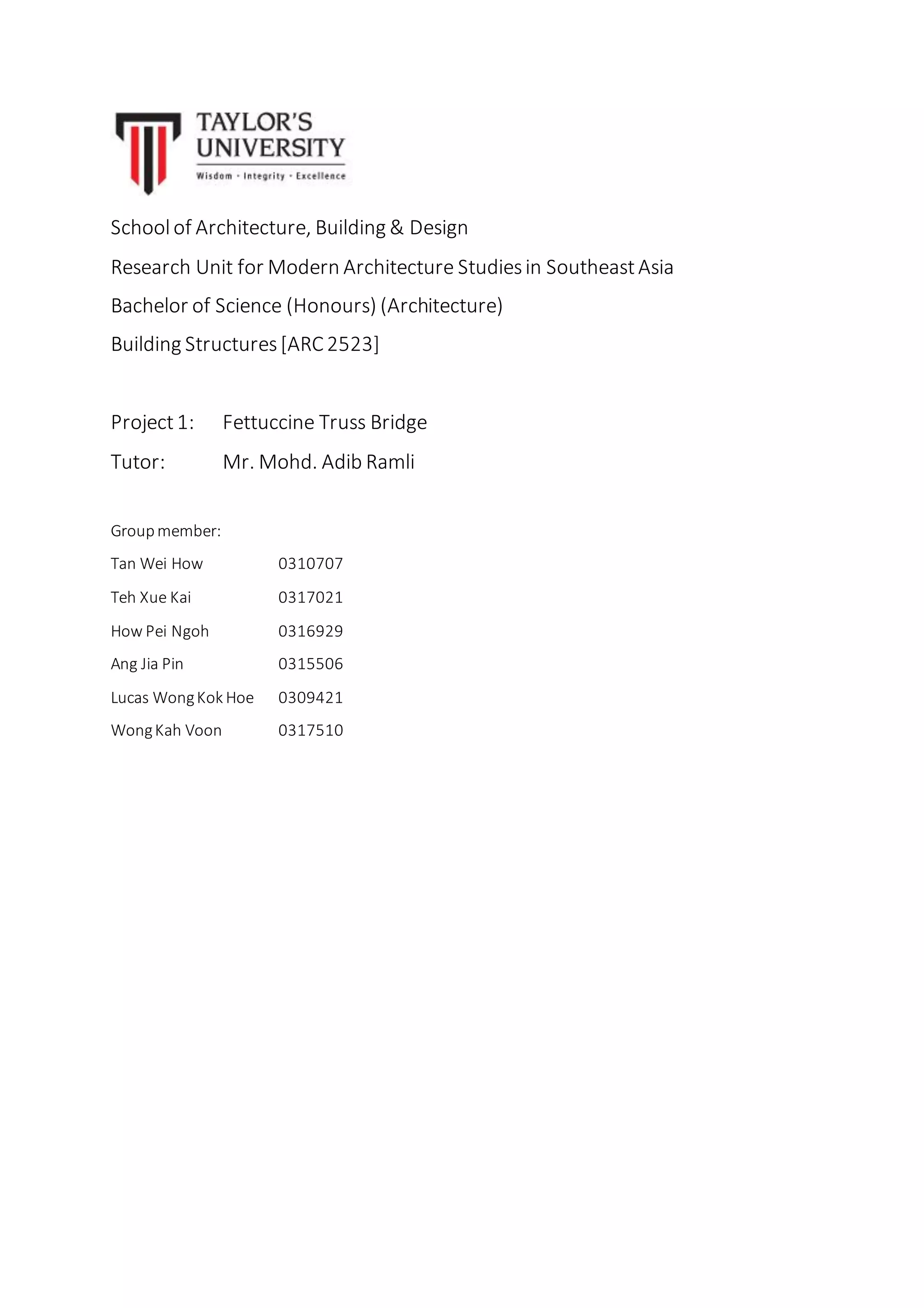 1. The document describes a student project to design a fettuccine truss bridge with a 750mm clear span and maximum weight of 200g.