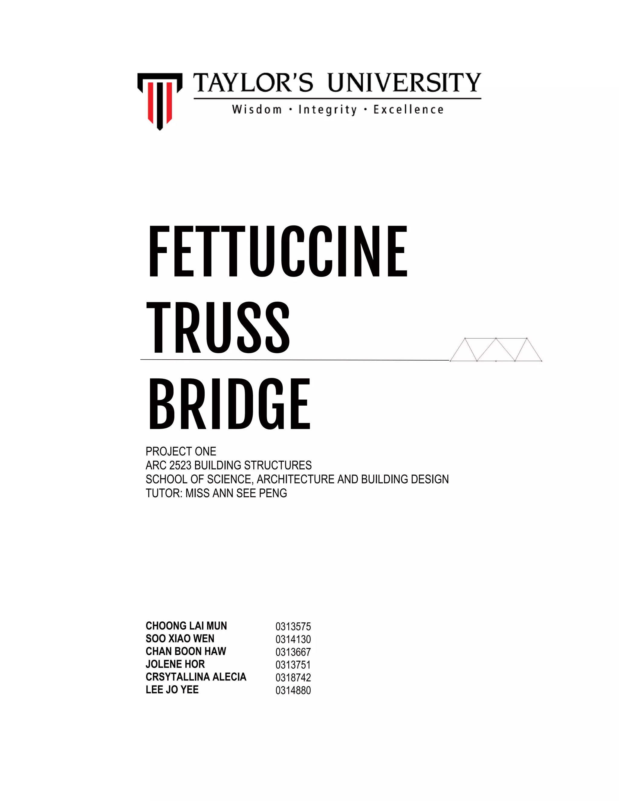 This document describes the process of designing and testing a fettuccine truss bridge. It begins with an introduction and methodology section outlining the goals and steps of the project. Materials testing is conducted to select the strongest type of fettuccine and adhesive. Multiple bridge designs are constructed and load tested, with improvements made based on results. A precedent truss bridge is studied for inspiration. The final optimized bridge design is load tested and calculations are performed to determine efficiency.