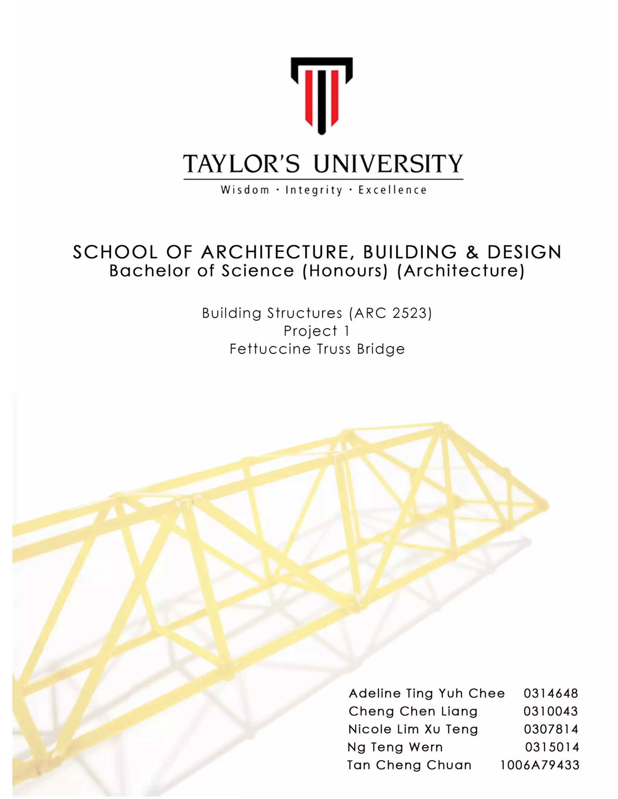 The document describes the process of designing and testing models of a truss bridge made of fettuccine. Four truss bridge models were constructed and tested to evaluate their load bearing efficiency. The final design adopted the Warren truss pattern and used an I-beam structure to strengthen the beams. Various materials and methods were tested to optimize the bridge's strength and weight. Load testing provided data to analyze failures and improve subsequent designs.