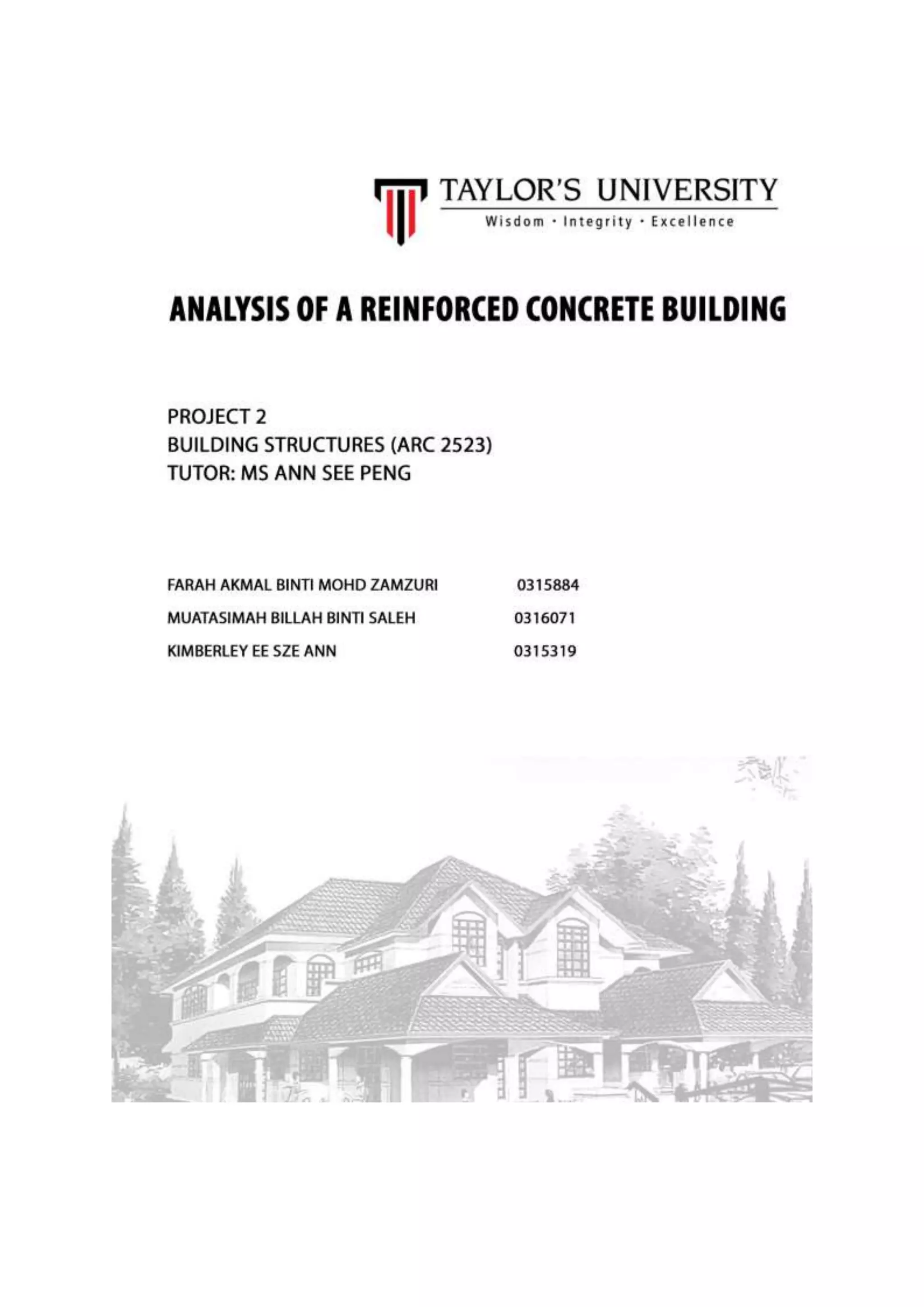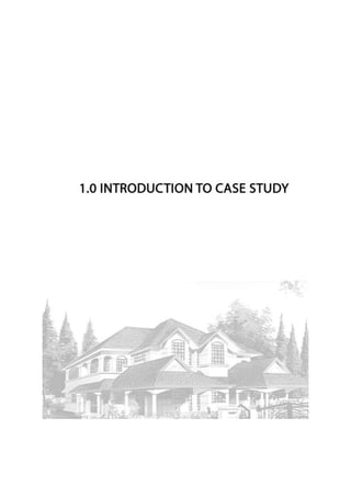 This document outlines the contents and structure of a case study report on a 2-story semi-detached house. Section 1 introduces the case study and includes the property description and original floor plans. Section 2 contains technical drawings such as the roof plan, floor plans, and structural plans. Section 3 consists of individual reports on the structural analysis of the building's beams and columns, with group members' names listed.