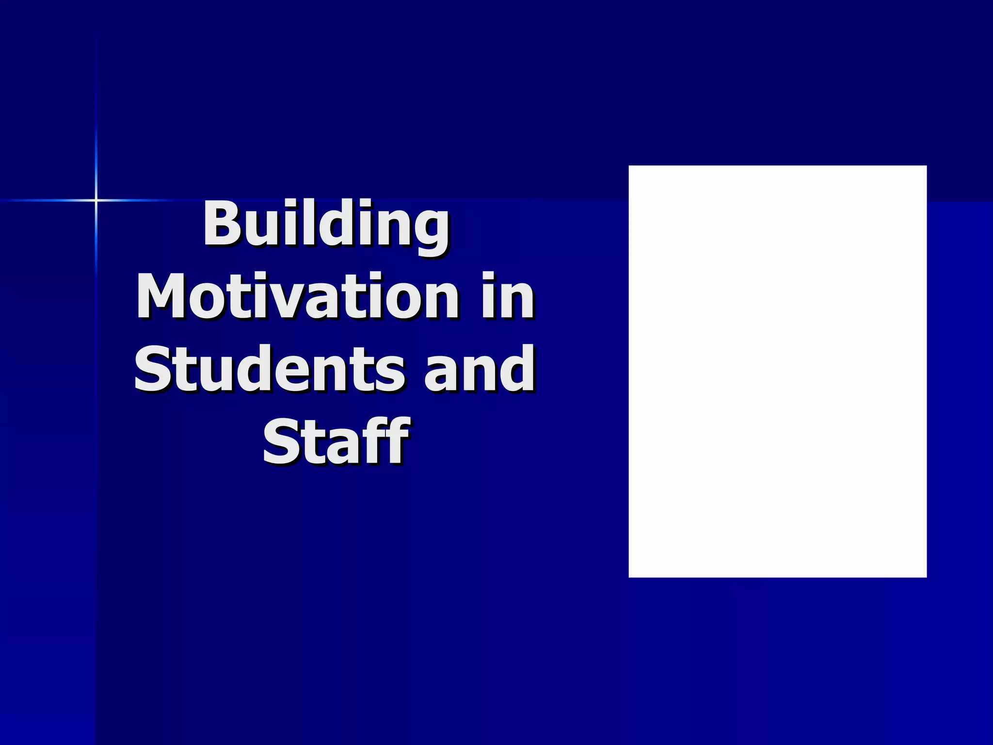 The document discusses various strategies for motivating students and staff in educational settings. It explores how intrinsic motivation can be developed through giving students choices, social interaction, ensuring they feel accountable, incorporating creativity, enabling success, and providing appropriate challenges and feedback. Modeling enthusiasm and regularly praising authentic efforts are also presented as important factors for motivation. The discussion suggests motivation is best supported through a cooperative approach where leadership is shared and staff work together on a common vision.