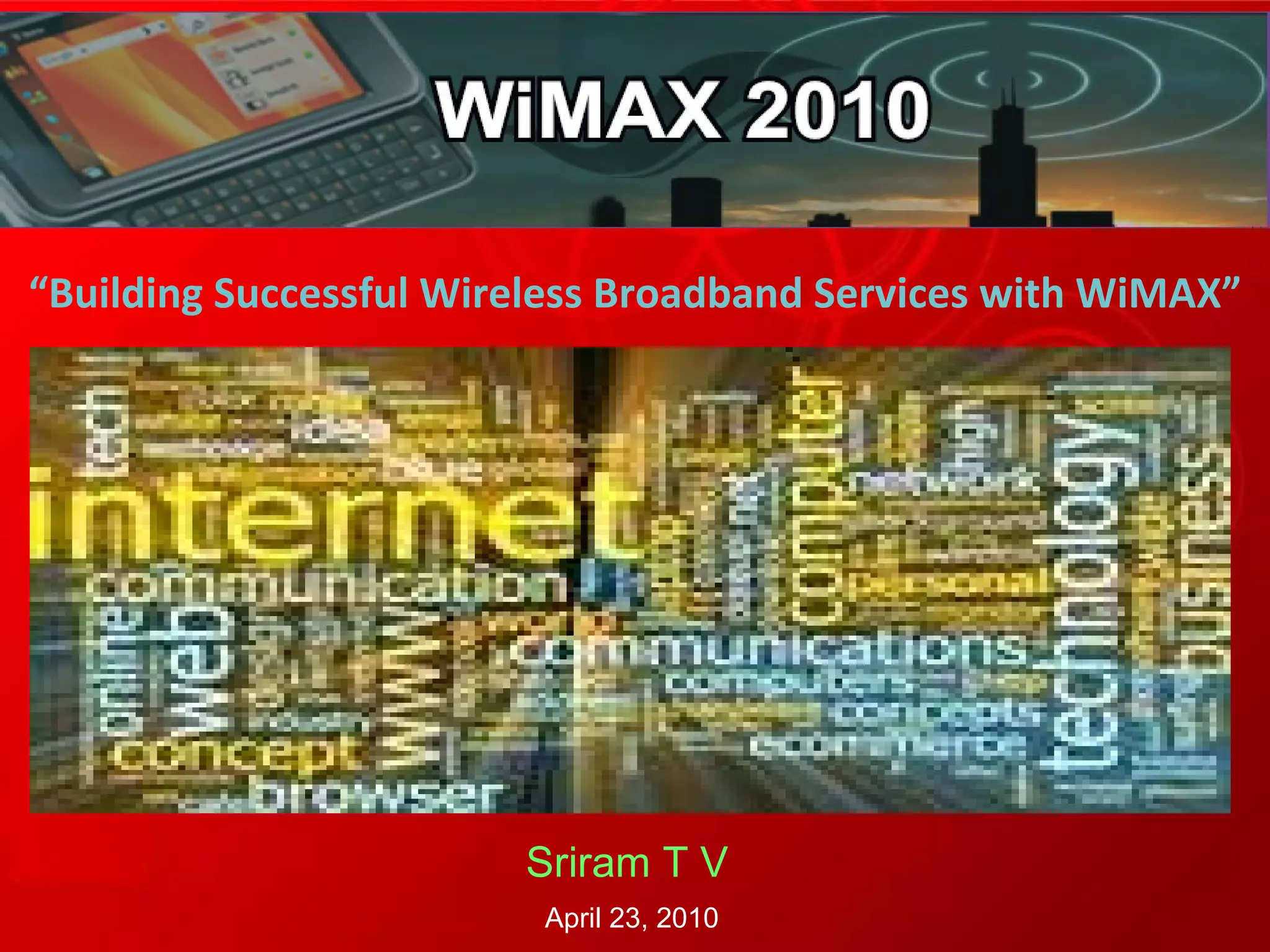 The document discusses opportunities for deploying WiMAX broadband services in India. It notes that broadband uptake is growing but still nascent in India. WiMAX can help narrow the digital divide by providing affordable last mile connectivity and backhaul in rural areas. It also sees opportunities for WiMAX to enable new applications and services across consumer, business, and industry segments. Key challenges for WiMAX include achieving reasonable returns on investment, developing the right business models, managing coverage versus capacity, and sustaining a good customer experience.