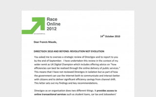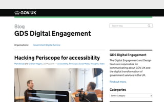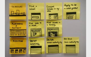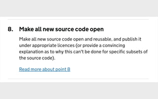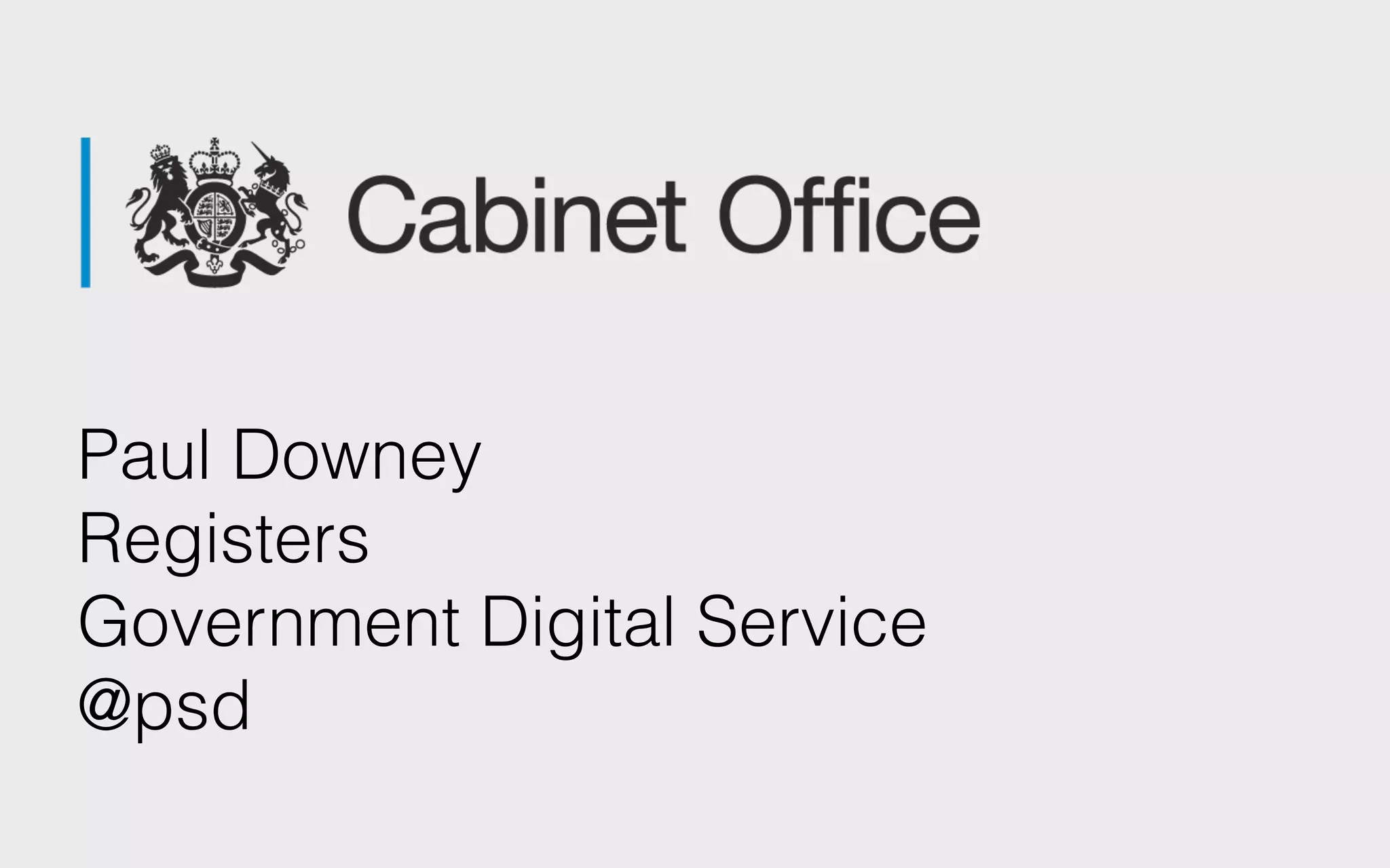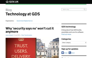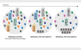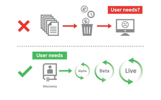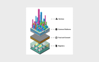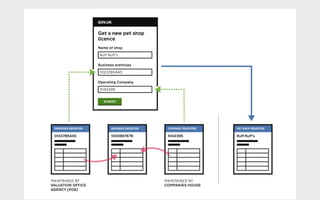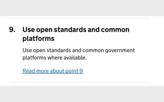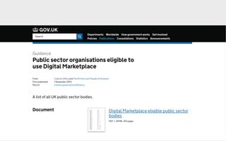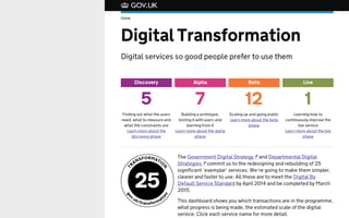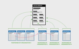 This document discusses the work of the Government Digital Service (GDS) in the UK. It summarizes some of GDS's key goals and principles, including starting with user needs, designing with data, doing less, and building things that others can build upon. It also mentions some specific digital services and platforms GDS has created, like GOV.UK Pay and Notify. Finally, it discusses GDS's work on establishing open registers of government data and moving toward a digital ecosystem in the UK.