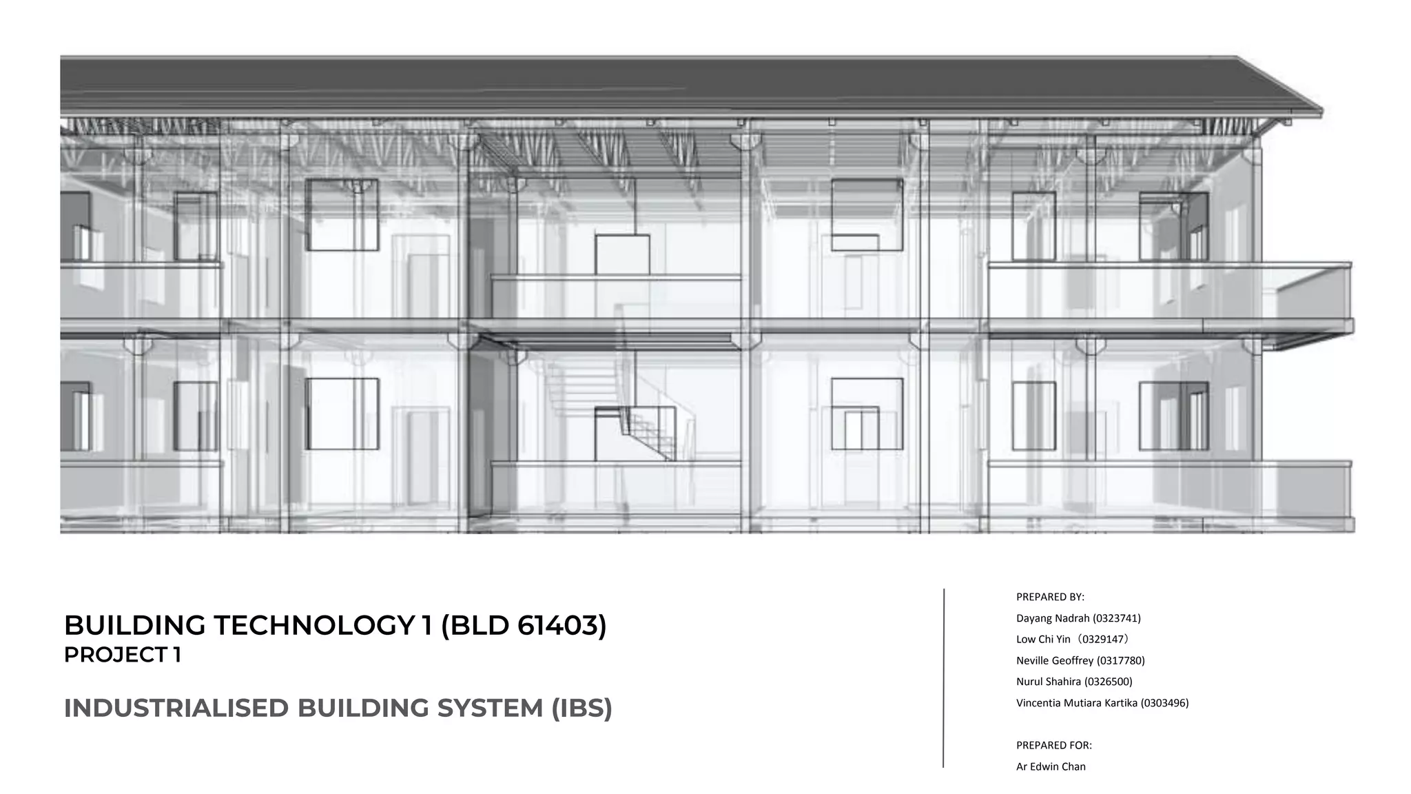 The document discusses Industrialized Building Systems (IBS) and proposes using several precast concrete systems - including precast columns, beams, slabs, walls, staircases and balconies - for a building project. It provides details on the manufacturing process for precast components and their advantages such as speed of construction, quality control and reduced maintenance costs. Connection methods are described for joining the various precast elements together on site.