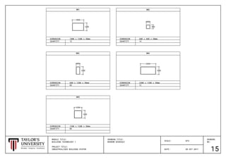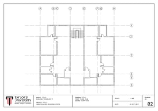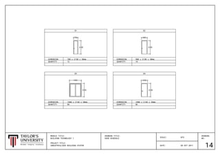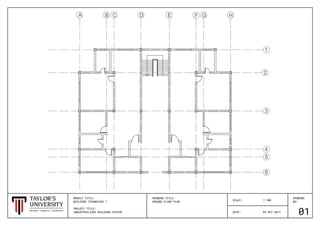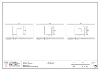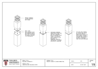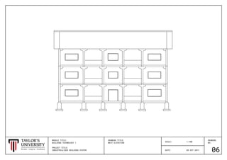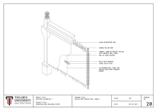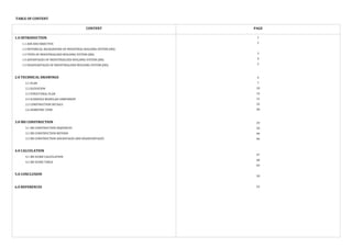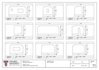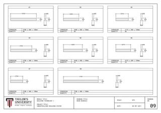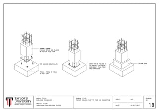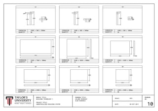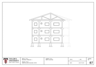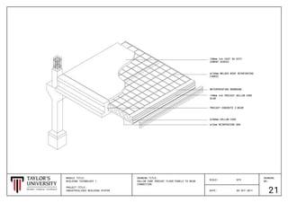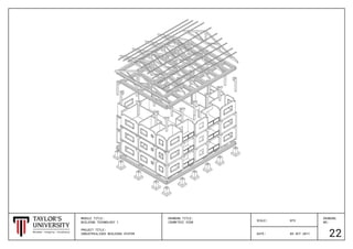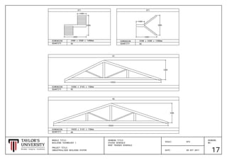 The document provides details of a project submission for an Industrialised Building Technology course. It includes an introduction covering the aims and objectives of the project, historical background of Industrialised Building Systems (IBS) in Malaysia, types of IBS, and advantages and disadvantages of IBS. It also includes technical drawings of floor plans, elevations, structural plans, component schedules, construction details and isometric views. Further sections describe IBS construction sequences, methods, advantages and disadvantages, as well as calculations for IBS score and conclusions.