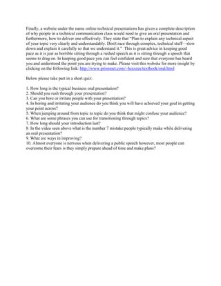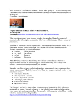 The document discusses tips for giving an effective oral presentation, including using transitions between topics, maintaining a good pace, and timing each section. It recommends introducing the topic in 2 minutes, spending 4 minutes on each of 3 main points, concluding in 2 minutes, and leaving 4 minutes for questions. Transitional phrases like "another", "accordingly", and "however" can help structure the presentation. Presenters should explain technical details slowly and avoid rushing. Maintaining a good pace helps ensure the audience understands the key points.