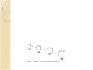 This chapter discusses challenges with very large data warehouses. As data warehouses grow larger over time by collecting granular historical data from many sources, normal database operations require more resources and storage costs increase dramatically. To manage costs and capacity for large volumes of data, it is important to separate infrequently used "dormant" data from actively used data and store dormant data in cheaper near-line or archival storage. Transparent cross-media storage management techniques can automatically move data between online, near-line, and archival storage tiers. These techniques help mitigate the rising costs of large data warehouses and maximize their storage capacity over time.