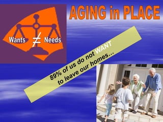 This document outlines a continuum of care model for aging adults that aims to improve quality of life and independence. It discusses how care needs may change over time from total independence to some dependence on others. The model proposes targeting all aging adults and providing various support services within their residence or at senior living communities to help them maintain independence and quality of life as they age. Examples of services include assistance with activities of daily living, wellness programs, social activities, and rehab sessions. The goal is to focus on capabilities rather than disabilities and create a "slippery slope" where residents naturally progress to higher levels of care seamlessly as needed for a win-win-win solution.