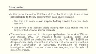 The document outlines the process of building theories from case study research. It begins with defining research questions and selecting cases for theoretical rather than statistical reasons. Researchers then craft data collection instruments and protocols, overlapping data analysis with collection. Within-case and cross-case analyses are used to identify patterns and relationships. Emerging theories are shaped by refining constructs and verifying relationships against case evidence. The literature is reviewed to compare theories and address inconsistencies. The iterative process continues until theoretical saturation is reached and new insights are minimal. The final theory may help explain phenomena and be empirically valid due to its close ties with evidence from multiple cases.