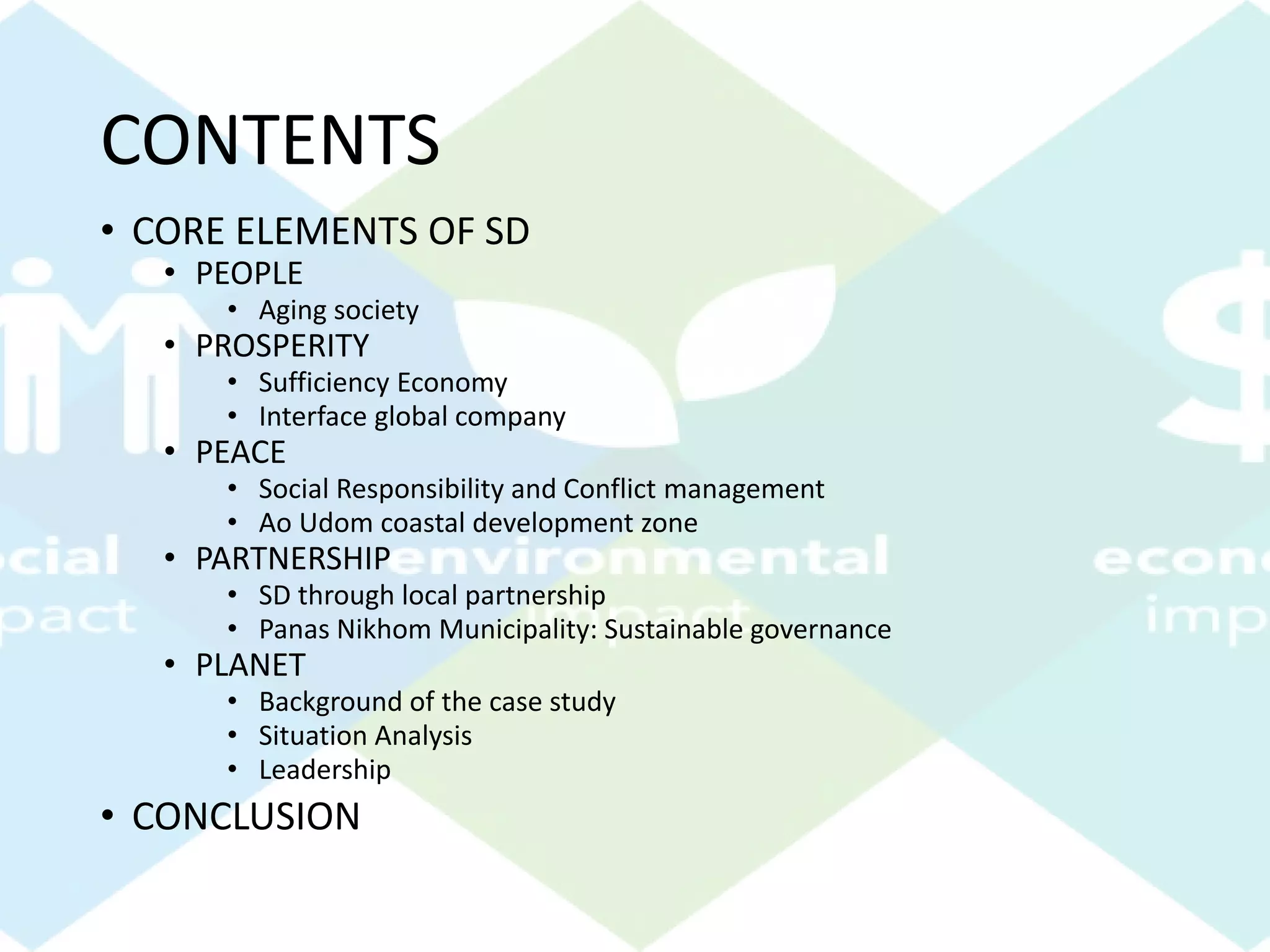 The document discusses various aspects of sustainable development, focusing on community engagement and self-sufficiency within organizations and local governments. It emphasizes the importance of partnerships, agriculture, and economic sufficiency to combat social and environmental challenges. Key themes include food security, climate change mitigation, and the role of leadership in fostering sustainable practices.