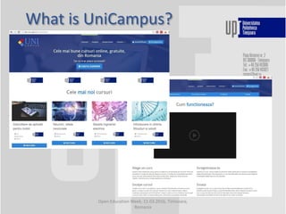 The document summarizes a presentation given at the Open Education Week in Timisoara, Romania on March 11, 2016. The presentation introduced UniCampus, an online platform for developing massive open online courses (MOOCs) at UPT University. It provided a demo of a course on UniCampus, shared results of a student evaluation of UniCampus courses, and concluded that UniCampus is a suitable platform for MOOC development and more courses will be offered in the future.