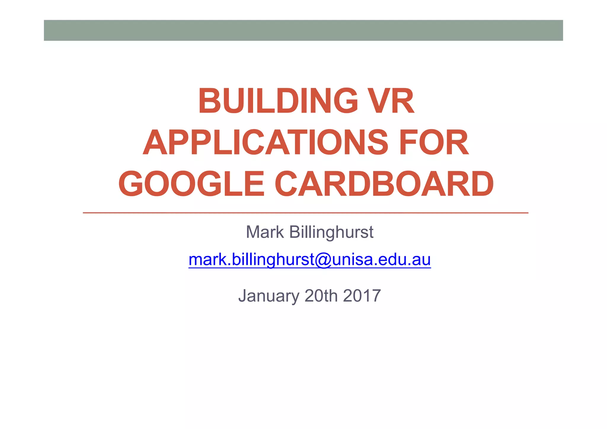 This document is a comprehensive guide on building virtual reality (VR) applications for Google Cardboard, including an introduction to VR, mobile VR development techniques, and project instructions using Unity3D. It covers essential concepts, tools needed, and step-by-step processes for creating various VR experiences such as immersive scenes, 360 panoramas, and gaze-based interactions. The guide incorporates design guidelines, resources, and practical examples to effectively develop engaging VR content.