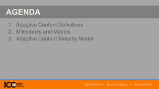 The document presents an overview of the adaptive content maturity model, defining adaptive content as intelligent content that adapts to user goals through structured and semantically rich organization. It outlines multiple phases of maturity from targeted content marketing to content interoperability, detailing steps for implementation including defining content strategies, setting rules, and building adaptive systems. The document emphasizes the importance of creating content that is reusable and adaptable, framing it as a business asset that supports efficiency and user engagement.
