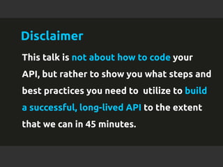 The document discusses best practices for building long-lasting APIs, emphasizing the importance of a long-term mindset, user understanding, and spec-driven development. It outlines five essential steps: think long-term, understand the API purpose, employ specification-driven development, incorporate best practices, and repeat these steps for new features. The talk highlights the significance of thoughtful design to avoid costly mistakes and ensure the API remains useful and effective over time.