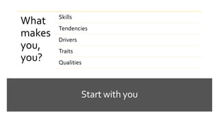 The document serves as a guide for individuals to develop their career paths by exploring personal skills, traits, and drivers. It emphasizes the importance of differentiating between a job and a career and encourages networking and self-reflection to identify one’s ideal career. Additionally, it highlights how to use existing roles as stepping stones towards future goals while mapping out a professional journey.