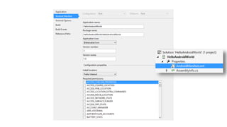 This document provides a comprehensive introduction to building Android applications using Xamarin, emphasizing the development fundamentals, such as activities, views, and intents. It covers the essential setup, fundamental concepts, and key components needed to create a coffee store manager app, including navigation, listviews, and deploying the application to the store. Additionally, it highlights the advantages of using C# and the Xamarin platform for cross-platform mobile development.