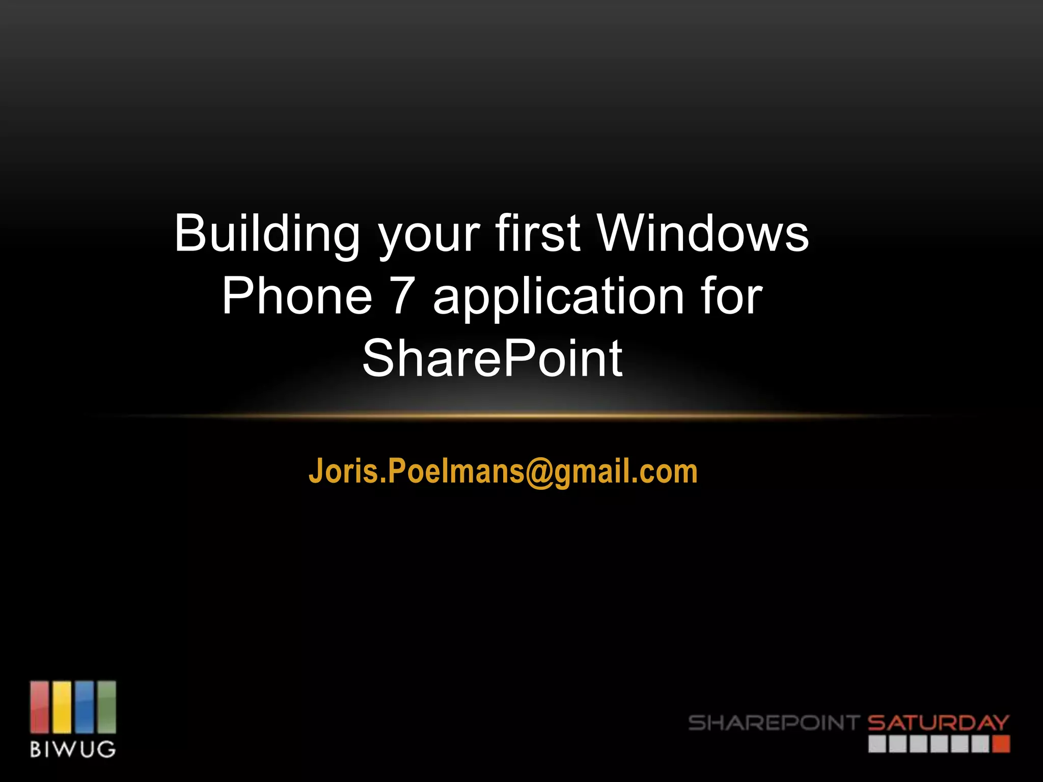 This document discusses building Windows Phone 7 applications to access SharePoint. It covers authentication with SharePoint, exploring different remote APIs like RSS, REST, and web services. It demonstrates integrating with SharePoint using RSS/ATOM feeds, the REST API, and social/search web services. The document emphasizes that authentication makes WP7 integration with SharePoint difficult but the SharePoint 2010 and WP7 Training Kit can help get started quickly building apps to extend SharePoint business solutions.