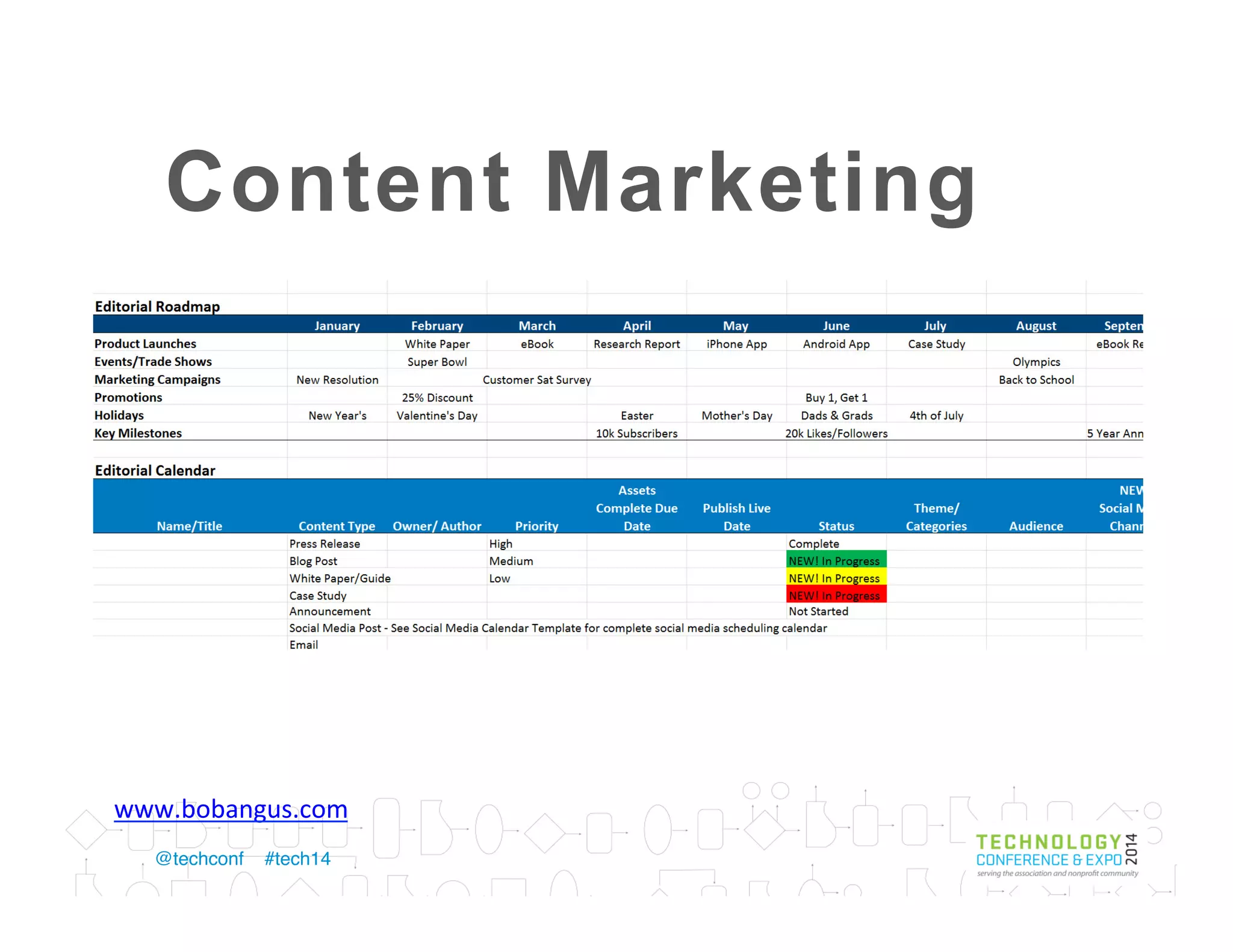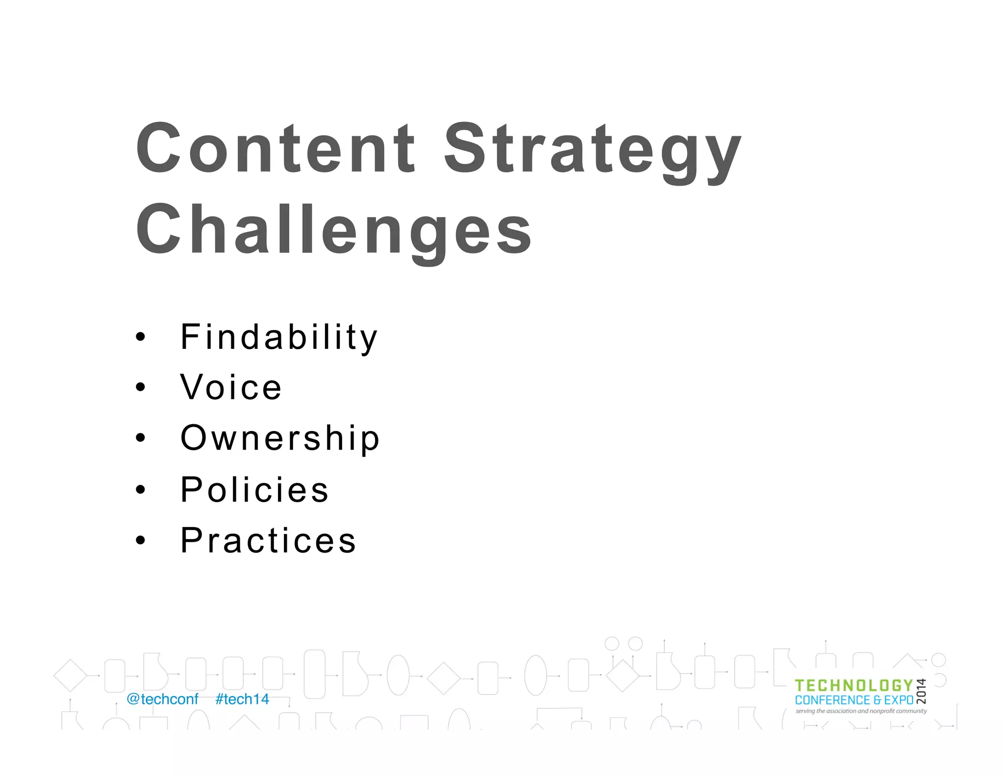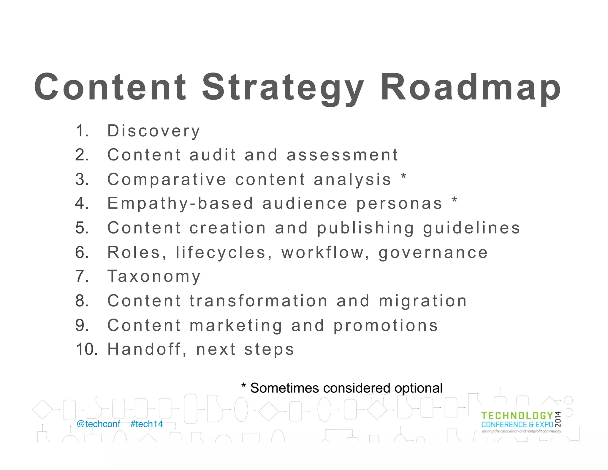 The document outlines a comprehensive content strategy roadmap, detailing steps such as content discovery, auditing, empathy-based audience personas, and the creation of guidelines. It highlights content strategy as a framework for managing change and emphasizes the importance of audience understanding, clear messaging, and effective governance. Additionally, it addresses common challenges and worst practices in content management, providing practical exercises and resources for implementation.