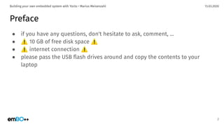 This document provides an overview of building an embedded system using Yocto. It begins with introductions to embedded systems and the Yocto Project. Embedded systems have dedicated functions within larger systems and consist of hardware, firmware, bootloaders, kernels, and userlands. Yocto helps developers create custom Linux distributions for any hardware by using recipes, layers, and the BitBake build tool to resolve dependencies. The document outlines initial setup with QEMU emulation, exploring a basic Yocto build, and provides examples of leaving the comfort zone by modifying builds and recipes.