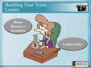 The document discusses building a team for real estate investing and home buying. It mentions including a lender, realtor, insurance agent, lawyer, accountant, handyman, property manager, and the option to outsource some tasks. The various team members can help with tasks like financing, transactions, legal issues, taxes, repairs, and property management for both personal home buying and income property investing.