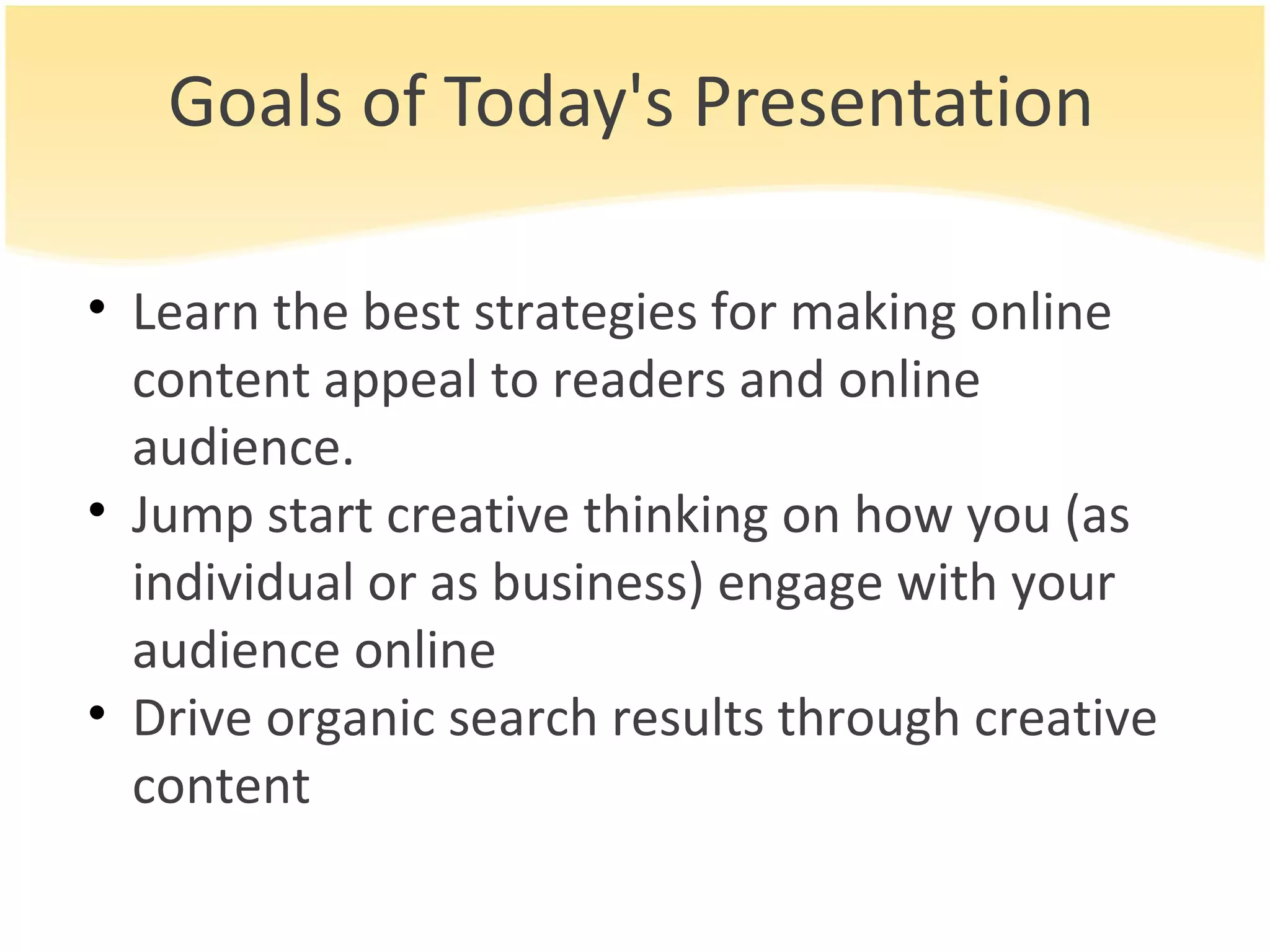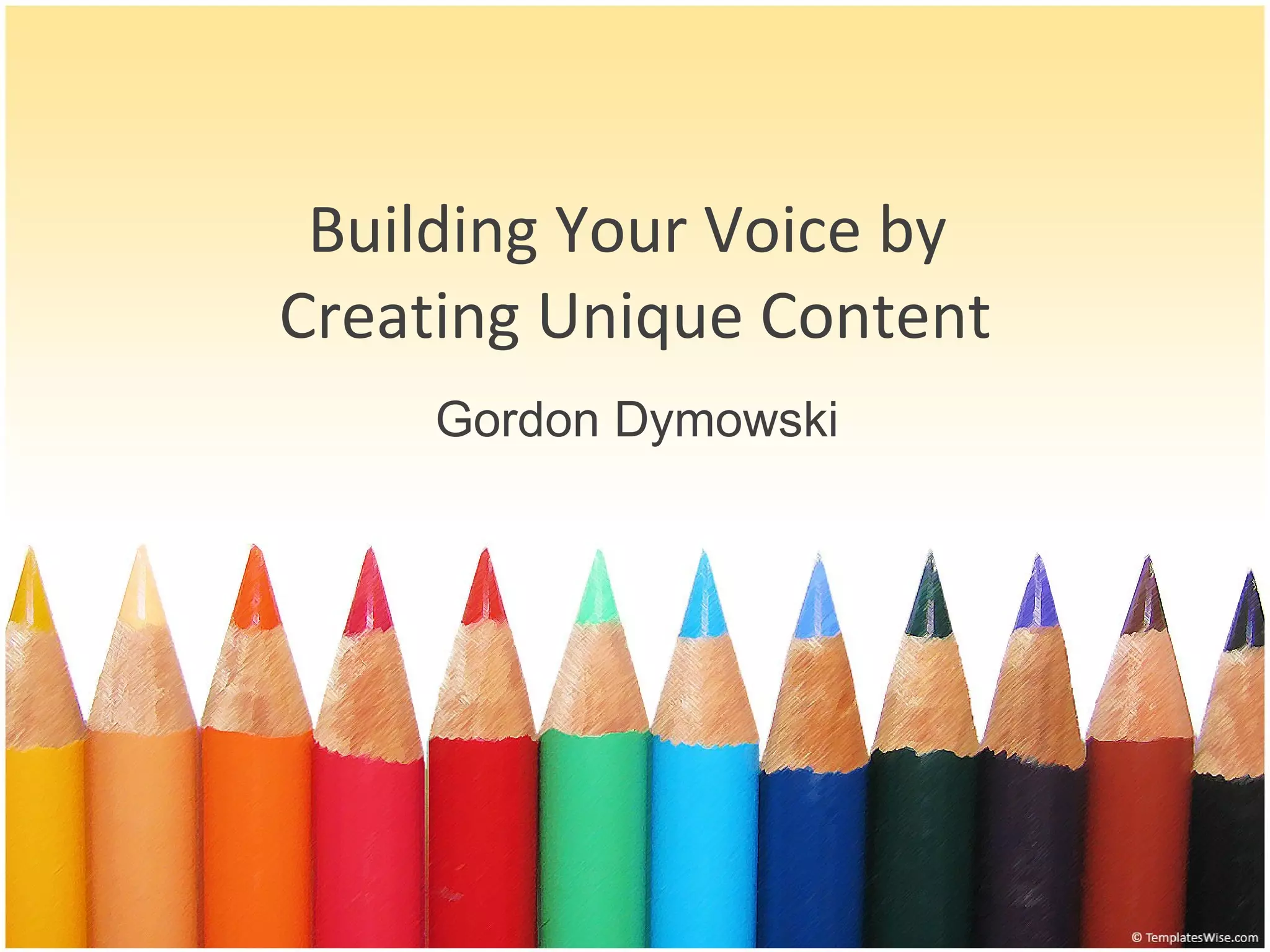 The document provides tips for creating unique online content to engage audiences and drive organic search results. It recommends getting to know your audience and yourself, capturing ideas as they happen, using the right tone for different channels like blogs, Twitter, Facebook and LinkedIn, and creating an editorial calendar to plan content posting. The key is bringing your own perspective to topics that interest your audience and engaging them in conversation.