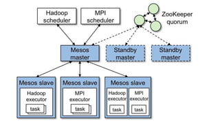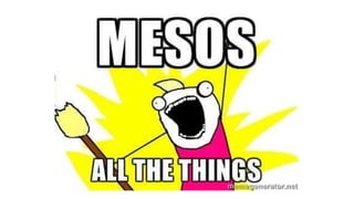 The document provides an overview of Apache Mesos, a platform for resource sharing that supports multiple frameworks like Marathon and Aurora for managing applications and resources in a data center. It discusses the architecture of Mesos, including its resource management capabilities such as CPU, memory, and disk allocation, as well as the implementation of constraints for task placement. Furthermore, it details the usage of Aurora for deploying long-running services with particular focus on job lifecycle and configurations using Thermos job objects.
