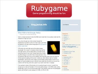 The document discusses building 2D and 3D games with Ruby using low-level APIs. It covers topics like building 2D games with Ruby SDL, building 3D games with Ruby OpenGL, and whether Ruby is a legitimate player in the gaming space. Examples provided include sample code for sprites, events, and extensions to interface with C libraries for graphics and game development.