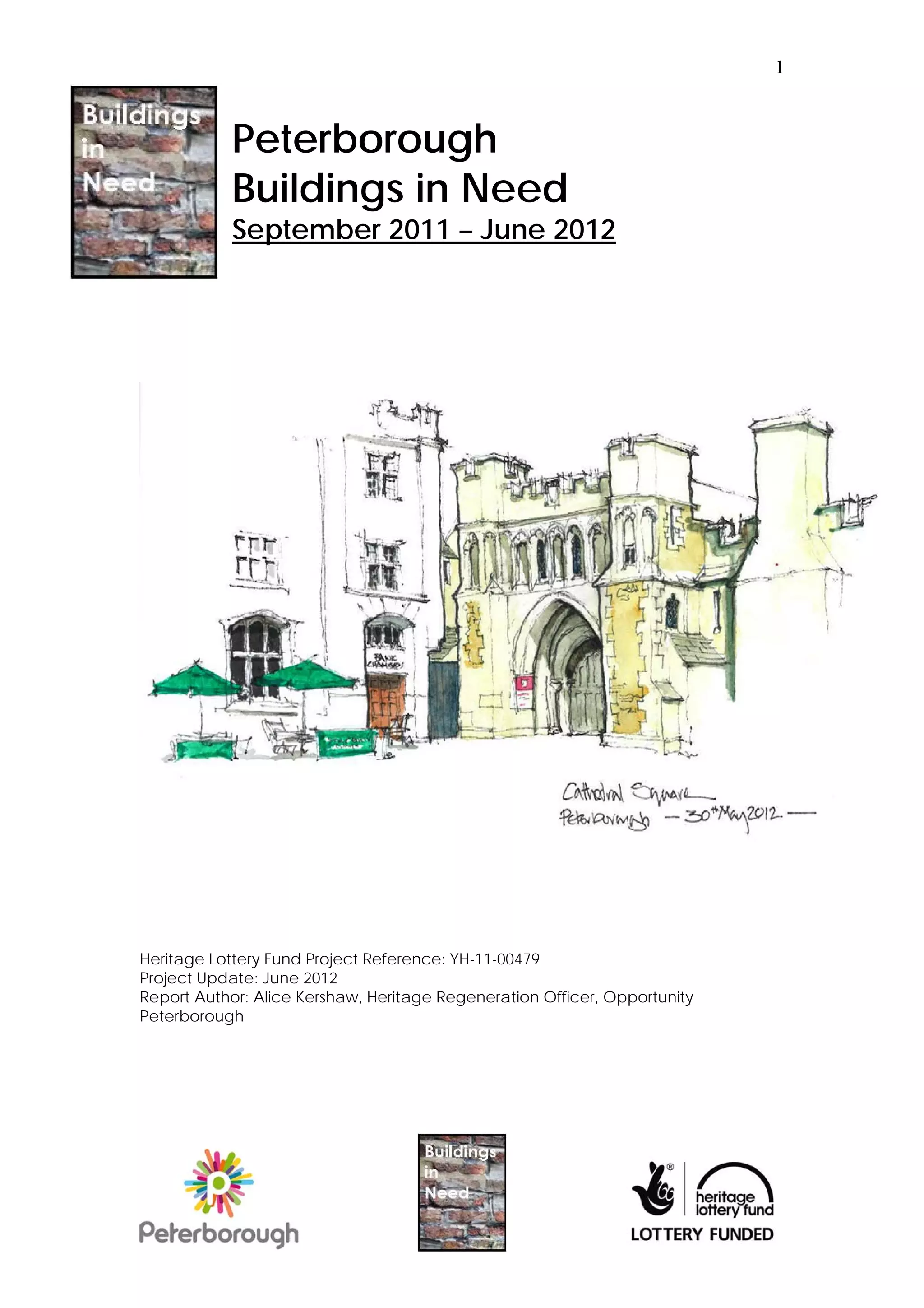 The document provides an overview and summary of the outcomes of the Peterborough Buildings in Need project. The project trained over 1,100 volunteers and members of the public through lectures and workshops to survey historic buildings in the city center. Volunteers surveyed over 250 buildings and the project website shares their findings. The project raised awareness of heritage preservation and engaged the community in understanding and monitoring buildings in need of rehabilitation.