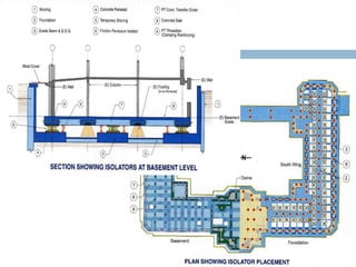 The document discusses buildings with base isolation techniques. It provides an overview of base isolation, including definitions of earthquakes, structural bearings, design requirements, and construction of base isolated buildings. It also presents a case study comparing the behavior of a fixed base building to a building with a base isolation system, using finite element modeling and modal analysis. The base isolated building showed significantly lower and longer period modal frequencies, indicating better seismic performance.