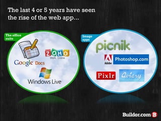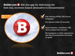 The Buildor Engine currently powers two applications: BuildorLite and BuildorPro. BuildorLite empowers content owners with ease of use and affordable pricing, allowing frequent updates for SEO and SEM. It also provides simple Google analytics and maps integration to understand user businesses. BuildorPro is described as a designer and developer's toolkit that received rave reviews from users for its productivity benefits when building websites.
