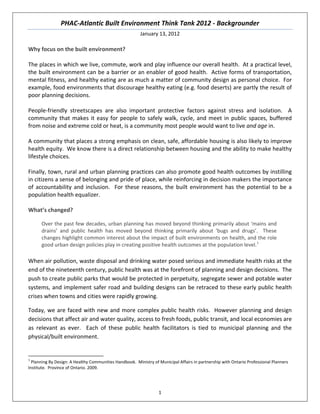 The document discusses the relationship between the built environment and public health. It notes that features like urban planning, transportation, access to healthy food and housing all impact health outcomes. Both public health and urban planning have evolved in their thinking to recognize this relationship. There are now opportunities for public health and planning professionals to work together to promote health through the built environment. The document proposes that PHAC-Atlantic could facilitate knowledge sharing between local and federal groups to help build capacity around healthy community design.