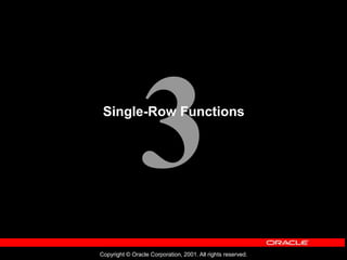 This document provides an overview of SQL single-row functions, including character, number, and date functions, as well as conversion functions. It outlines how to manipulate data, perform calculations, and format output in SQL queries. Additionally, it covers the use of conditional expressions and NULL-handling functions, summarizing key concepts for working with data in SQL.