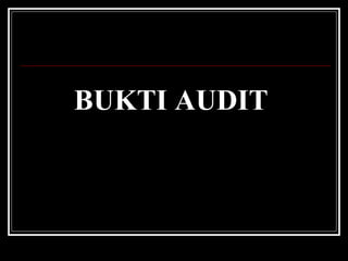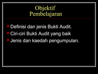 Dokumen tersebut membahas mengenai bukti audit, termasuk definisi, ciri-ciri, jenis, dan metode pengumpulan bukti audit. Bukti audit diperlukan untuk mendukung pendapat dan kesimpulan auditor dan diperoleh dari berbagai sumber seperti dokumen, wawancara, observasi, dan analisis. Dokumentasi bukti audit penting untuk menunjang laporan audit.