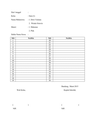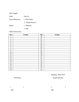 Dokumen ini mencantumkan daftar nama mahasiswa dan materi pelajaran untuk kelas satu hingga enam di Bandung pada Maret 2015. Setiap kelas memiliki beberapa topik yang berbeda seperti makanan, plak, gingivitis, dan kebiasaan buruk. Terdapat juga daftar siswa untuk setiap kelas dengan nomor urut yang jelas.