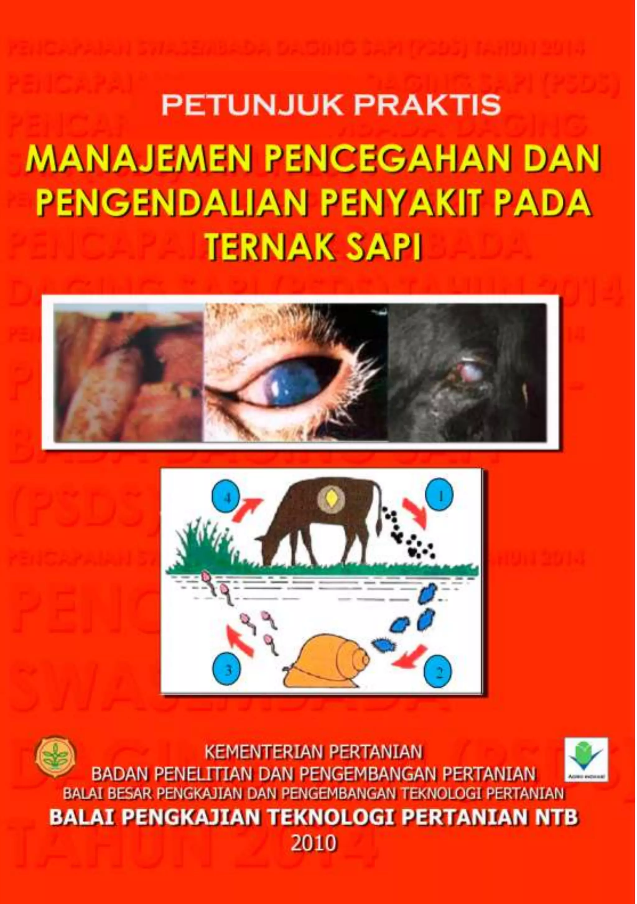 Buku petunjuk praktis ini membahas manajemen pencegahan dan pengendalian penyakit pada ternak sapi di NTB, dengan menjelaskan beberapa penyakit utama seperti antrax, septichaemia epizootica, surra, scabies, dan cacingan beserta gejala dan tindakan pencegahannya. Buku ini diharapkan dapat meningkatkan produktivitas ternak sapi di NTB.