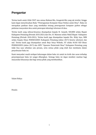 Buku ini adalah panduan pemrograman dasar Python yang ditujukan untuk masyarakat desa, membahas instalasi, penggunaan, dan pemahaman dasar Python. Ditulis dengan ucapan terima kasih kepada berbagai pihak, buku ini bertujuan memberikan manfaat dan kemudahan bagi pembaca dalam menerapkan teknologi informasi. Buku ini juga menyertakan berbagai komponen penting dalam pemrograman Python, termasuk tipe data, variabel, dan struktur kontrol.