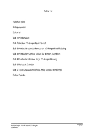Buku panduan ini memberikan panduan singkat tentang desain 3D dengan Solidworks. Buku ini terdiri dari 6 bab yang mencakup topik seperti membuat sketsa 2D dan komponen 3D, rakitan 3D, gambar kerja 2D, cetakan gambar, dan topik khusus seperti sheet metal dan desain cetakan. Setiap bab dijelaskan dengan contoh ilustrasi dan langkah-langkahnya.
