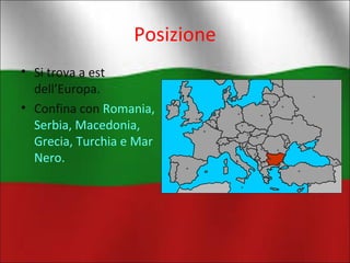 La Bulgaria, situata a est dell'Europa, confina con Romania, Serbia, Macedonia, Grecia, Turchia e il Mar Nero, con Sofia come capitale. Ha una superficie di 110.970 km2 e una popolazione di circa 7,76 milioni di abitanti, per lo più di religione ortodossa e che parlano principalmente bulgaro. Il paese presenta un clima continentale, una geografia montuosa con i Monti Balcani e Rodopi, e un'importante rete fluviale, con il Danubio come fiume principale.