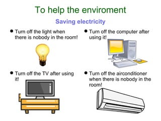 The document provides tips for helping the environment by saving electricity, water, and petrol through turning off lights, electronics, and air conditioners when not in use, taking showers instead of baths, checking for leaks, separating rubbish into different bins for recycling, and using bicycles or walking instead of cars.
