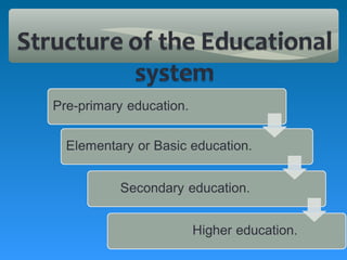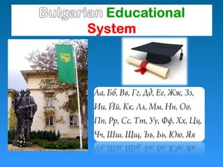 Bulgaria has a compulsory education system between ages 7-16 divided into two school terms. It includes pre-primary education, primary/basic education, and higher education options. Higher education institutions include specialized higher schools like academies and institutes focusing on specific subjects. Universities offer broad subjects across humanitarian, science, social and technical areas with their own research resources. Colleges provide shorter, professionally oriented training often associated with universities. The text provides an example of a specialized secondary school in Bulgaria with over 1000 students, classes, teachers, and language offerings.